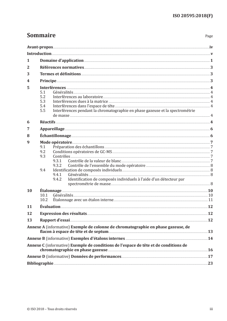 - Supporting content: Guidance on reagents, apparatus, sampling, GC‑MS operating conditions, calibration (including internal standards), evaluation, reporting and example conditions are supplied in informative annexes. Performance data and limitations are provided.