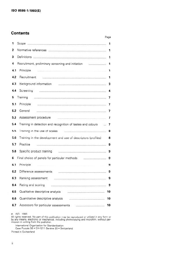 ISO 8586-1:1993 is a standard published by the International Organization for Standardization (ISO). Its full title is "Sensory analysis — General guidance for the selection, training and monitoring of assessors — Part 1: Selected assessors". This standard covers: Supplements the information given in ISO 6658. The entire process includes recruitment, preliminary screening and initiation; training in general principles and methods; selection for particular purposes; monitoring performance; possible training as expert assessors.