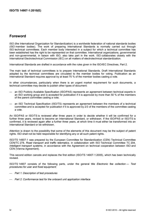 ISO/TS 14907-1:2010 is a technical specification published by the International Organization for Standardization (ISO). Its full title is "Electronic fee collection — Test procedures for user and fixed equipment — Part 1: Description of test procedures". This standard covers: ISO/TS 14907-1:2010 specifies the test procedures of EFC road-side equipment (RSE) and on-board equipment (OBE) with regard to the conformance to standards and requirements for type approval and acceptance testing which is within the realm of EFC application specifically. ISO/TS 14907-1:2010 is restricted to systems operating within the radio emission, EMC regulations, traffic and other regulations of the countries in which they are operated and it is therefore a requirement that all required equipment approvals from an authenticated and accredited test house have been obtained in order to claim compliance. ISO/TS 14907-1:2010 identifies a set of suitable parameter and provides test procedures to enable the proof of a complete EFC-system as well as components of an EFC-system e.g. OBE related to the defined requirements of an application. The defined parameter and tests are assigned to the following groups of parameters: — functionality; — quality; — referenced pre-tests. ISO/TS 14907-1:2010 describes procedures, methods and tools, and a test plan which shows the relation between all tests and the sequence of these tests. It lists all tests that are required to measure the performance of EFC equipment. It describes which EFC-equipment is covered by the test procedures; the values of the parameters to be tested are not included. It also describes how the tests are to be performed, and which tools and pre-requisites are necessary before this series of tests can be undertaken. It is assumed that the security of the system is inherent in the communications and EFC functionality tests, therefore they are not addressed here. All tests in ISO/TS 14907-1:2010 provide instructions to evaluate the test results. The test procedures can be used for prototype testing, type approvals, test of installations and periodic inspections. ISO/TS 14907-1:2010 defines only the test and test procedures, not the benchmark figures that these are to be measured against. EFC-systems for DSRC consist, in principle, of a group of technical components, which in combination fulfil the functions required for the collection of fees by electronic automatic means. These components comprise all, or most of, the following: — on-board equipment (OBE) within a vehicle; — on-board unit containing the communications and computing sub-functions; — optional integrated circuit card which may carry electronic money, service rights and other secured information; — communication between OBE and RSE based on DSRC; — equipment for the fee collection at the road-side (RSE) containing the communications and computing sub-functions; — equipment for the enforcement at the road-side; — central equipment for the administration and operation of the system. ISO/TS 14907-1:2010 relates solely to OBE and RSE and the DSRC interface between OBE and RSE including its functions to perform the fee collection. All the equipment used for enforcement (e.g. detection, classification, localization and registration) and central equipment are outside the scope of ISO/TS 14907-1:2010.