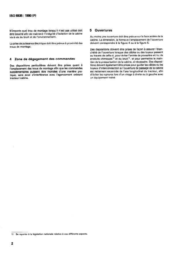 ISO 8935:1990 specifies requirements for mounting and apertures on agricultural and forestry tractors to accommodate external equipment controls and instrumentation used for remote operation. The standard covers physical mounting points, hole spacing and thread requirements, location guidance (including provision for an electrical power‑point), and apertures through which control cables or hoses enter the tractor cab. Illustrative figures show typical mounting and aperture configurations.