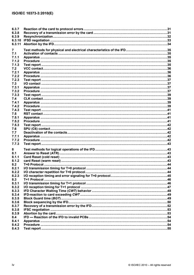 ISO/IEC 10373-3:2010 defines test methods for characteristics of integrated circuit cards with contacts and related interface devices according to the definition given in ISO/IEC 7816. Each test method is cross‑referenced to one or more base standards, which can be ISO/IEC 7810 or one or more of the supplementary International Standards that define the information storage technologies employed in identification card applications. ISO/IEC 10373-3:2010 defines test methods which are specific to integrated circuit technology with contacts. ISO/IEC 10373-1 defines test methods which are common to one or more card technologies and other parts define other technology‑specific tests. Test methods defined in ISO/IEC 10373-3:2010 are intended to be performed separately and independently. A given card is not required to pass through all the tests sequentially. The test methods defined in ISO/IEC 10373-3:2010 are based on ISO/IEC 7816-3. Conformance of cards and IFDs determined using the test methods defined in ISO/IEC 10373-3:2010 does not preclude failures in the field. Reliability testing is outside the scope of ISO/IEC 10373-3:2010. ISO/IEC 10373-3:2010 does not define any test to establish the complete functioning of integrated circuit cards. The test methods require only that the minimum functionality be verified. Minimum functionality is defined as follows. Any integrated circuit present in the card continues to show an Answer to Reset response which conforms to the base standard. Any contacts associated with any integrated circuit present in the card continue to show electrical resistance which conforms to the base standard.
