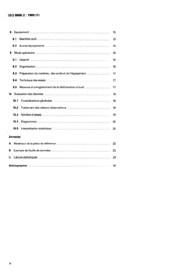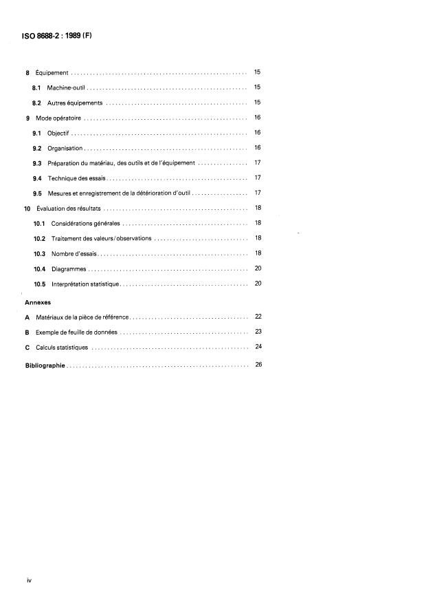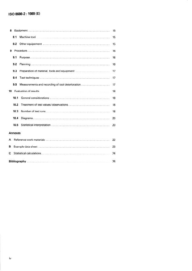 - Assessment, measurement and reporting: Specifies how to assess tool deterioration and establish tool‑life criteria, test planning and procedures, recording methods, evaluation (including statistical treatment) and presentation of results. Annexes include reference materials, example data sheets and statistical calculations.