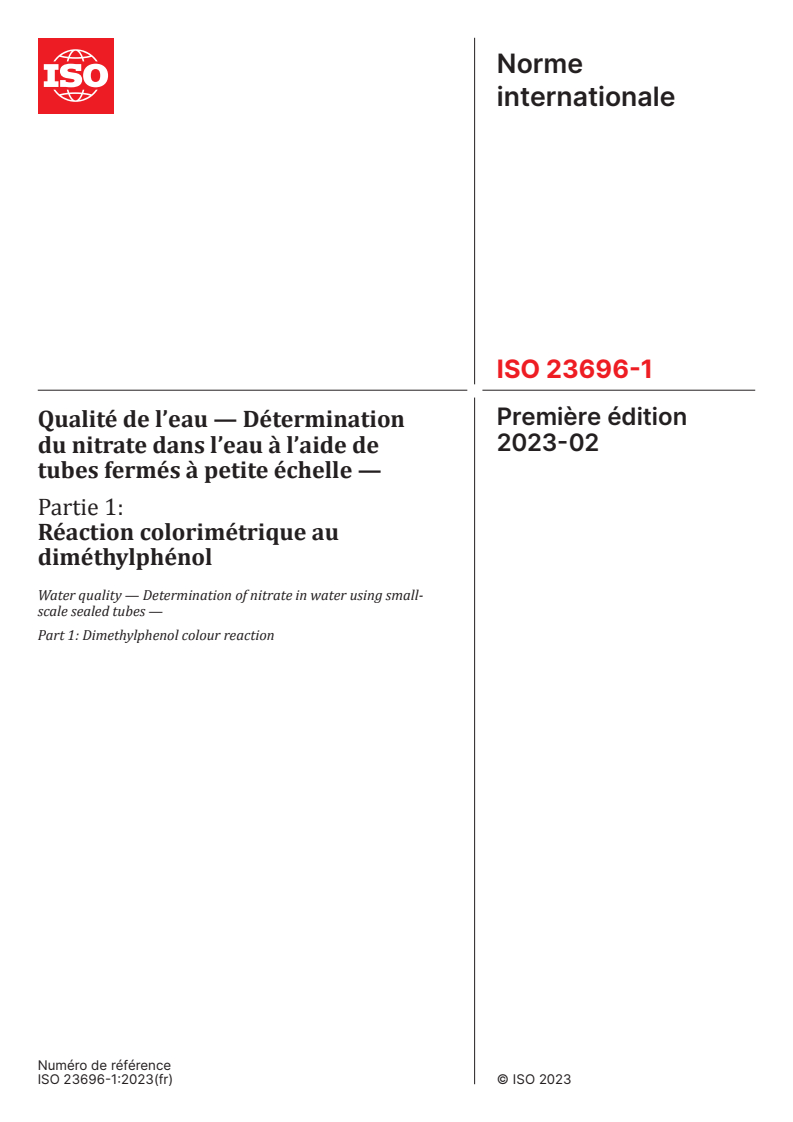ISO 23696-1:2023 - Qualité de l’eau — Détermination du nitrate dans l’eau à l’aide de tubes fermés à petite échelle — Partie 1: Réaction colorimétrique au diméthylphénol Released:2/12/2026
