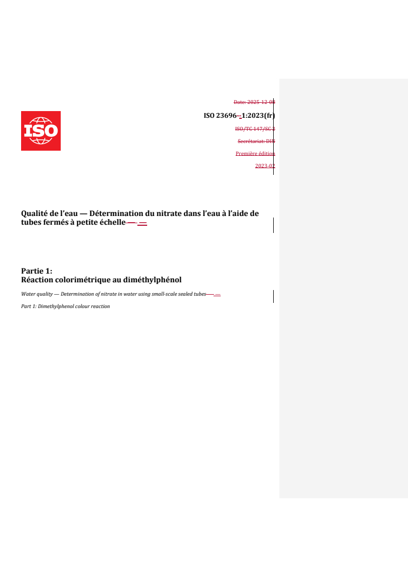 REDLINE ISO 23696-1:2023 - Qualité de l’eau — Détermination du nitrate dans l’eau à l’aide de tubes fermés à petite échelle — Partie 1: Réaction colorimétrique au diméthylphénol Released:2/12/2026