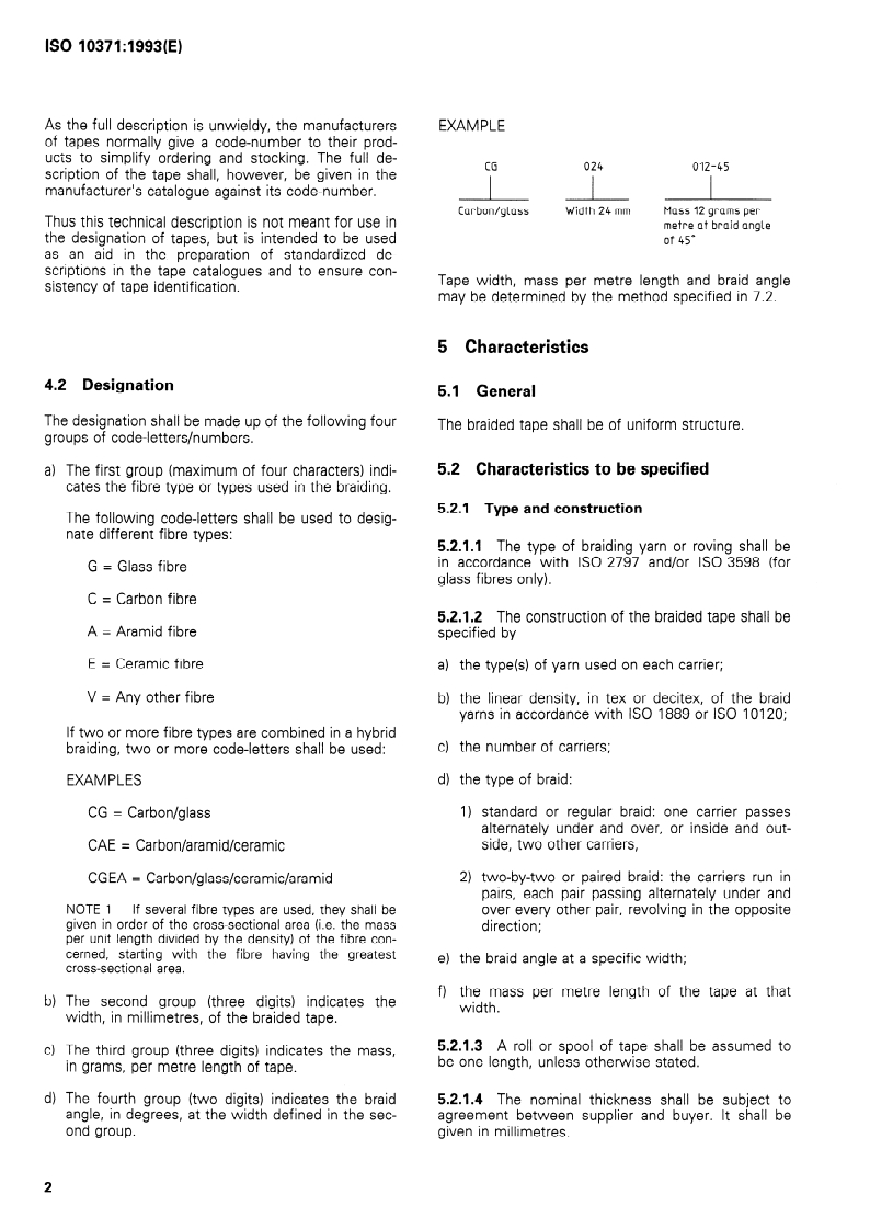 Braided tapes are designated using a code made up of fiber types, tape width (mm), mass per metre (g/m), and braid angle (degrees). The standard defines how to interpret and generate these codes based on measured physical properties.Characteristics and Defects