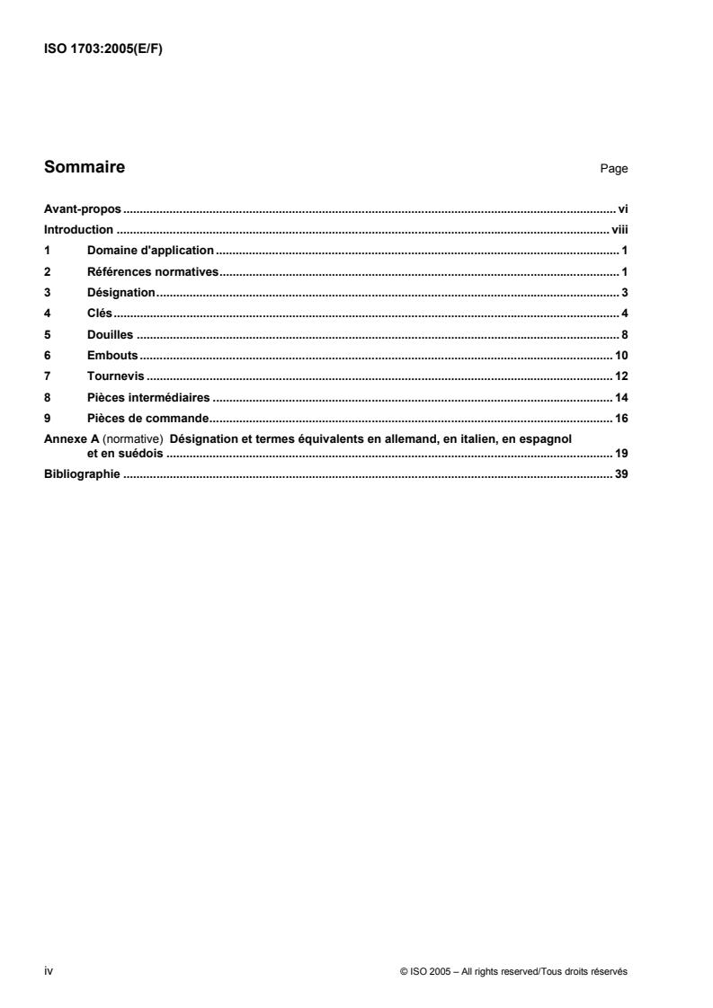 ISO 1703:2005 is a standard published by the International Organization for Standardization (ISO). Its full title is "Assembly tools for screws and nuts — Designation and nomenclature". This standard covers: ISO 1703:2005 gives a nomenclature in English and French of assembly tools for screws and nuts.