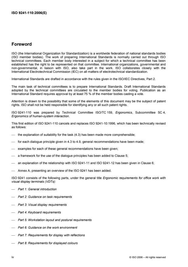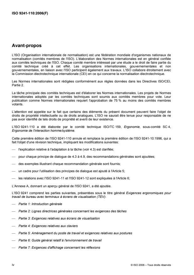 L'ISO 9241-110:2006 énonce des principes de conception ergonomiques formulés en termes généraux (c'est-à-dire qu'ils sont présentés sans référence à des situations d'utilisation, à des applications, à des environnements ou à une technologie) et fournit un cadre relatif à l'application de ces principes dans l'analyse, la conception et l'évaluation des systèmes interactifs. Bien qu'elle s'applique à tous les types de systèmes interactifs, l'ISO 9241-110:2006 ne couvre pas les spécificités de tous les contextes d'utilisation (par exemple, les systèmes critiques pour la sécurité, le travail collaboratif). L'ISO 9241-110:2006 est destinée aux concepteurs d'outils de développement d'interfaces utilisateurs, de guides de style et d'interfaces utilisateurs, aux développeurs, aux acheteurs et aux évaluateurs. L'ISO 9241-110:2006 est centrée sur les principes de dialogue associés à la conception ergonomique du dialogue entre l'utilisateur et le système interactif, et ne tient pas compte de tout autre aspect de conception tel que le marketing, l'esthétique et la conception interne à l'entreprise. La liste des recommandations pour les différents principes de dialogue n'est pas exhaustive.