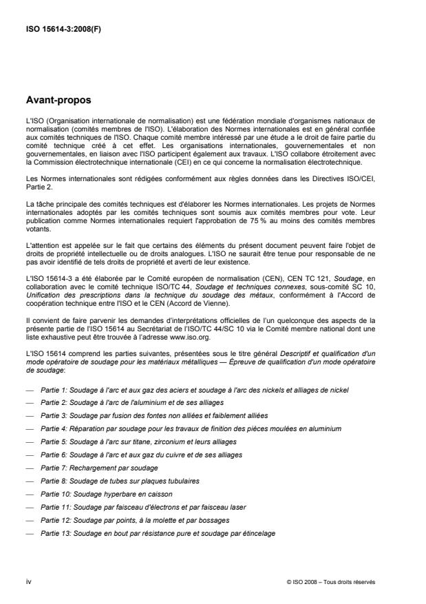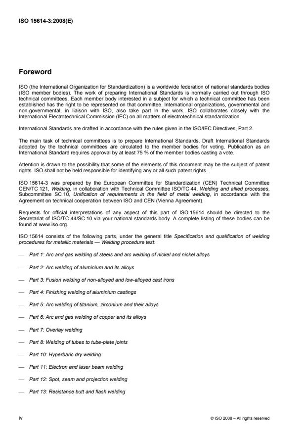 ISO 15614-3:2008 specifies how a preliminary welding procedure specification (pWPS) for production and repair welding of non-alloyed and low-alloyed cast irons is qualified by fusion welding procedure tests. ISO 15614-3:2008 defines the conditions for execution of the welding procedure tests and the range of qualification for welding procedures for all practical welding operations within the range of a defined list of variables. ISO 15614-3:2008 is applicable to all new welding procedures. However, it does not invalidate previous welding procedure tests made to former national standards or specifications. Where additional tests have to be carried out to make the qualification technically equivalent, it is only necessary to do the additional tests on a test piece made in accordance with ISO 15614-3:2008. Additional tests may be required by application standards. ISO 15614-3:2008 is applicable to welding non-alloyed and low-alloyed grey cast iron castings according to: EN 1561; EN 1562; EN 1563; and EN 1564. The principles of ISO 15614-3:2008 are also applicable for welding cast iron to steel or to other unalloyed and low-alloyed cast iron materials.