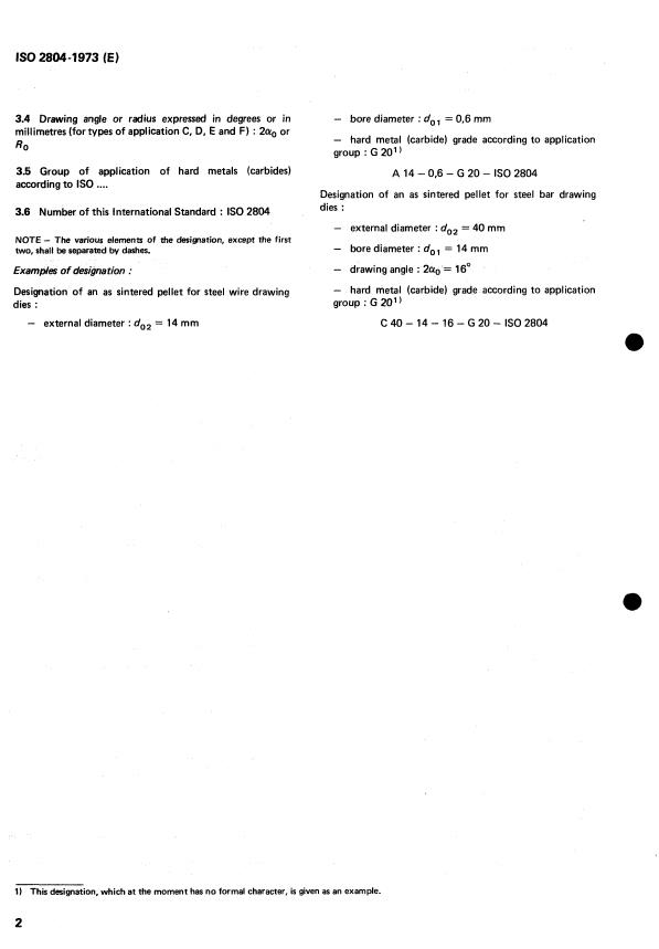 ISO 2804:1973 is a standard published by the International Organization for Standardization (ISO). Its full title is "Wire, bar or tube drawing dies — As sintered pellets of hard metal (carbide) — Dimensions". This standard covers: Wire, bar or tube drawing dies — As sintered pellets of hard metal (carbide) — Dimensions