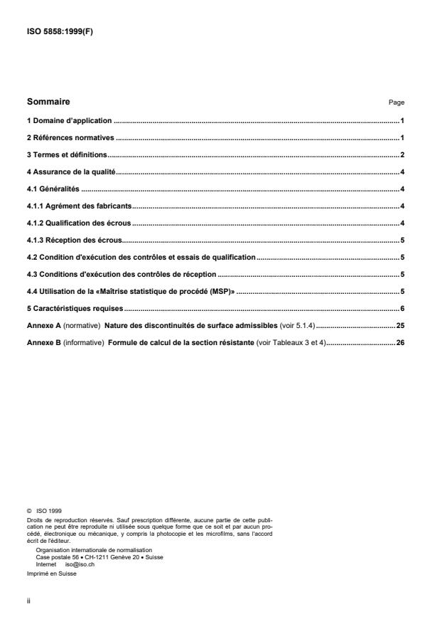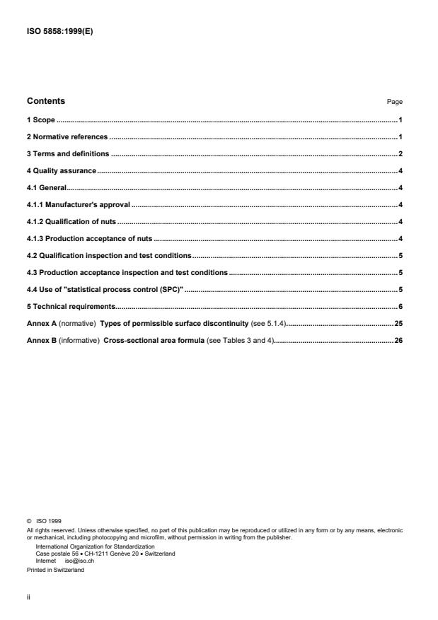 ISO 5858:1999 is an international procurement specification for metric self-locking nuts with MJ threads intended for aerospace use at a maximum operating temperature ≤ 425 °C. The standard specifies the required characteristics, inspection and test regimes, quality assurance, sampling plans and acceptance criteria for finished nuts. It is intended to be referenced in a nut’s definition document (drawing, national or in‑house standard) to make the requirements contractually binding.