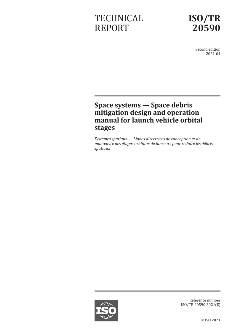ISO/TR 20590:2021 is a technical report published by the International Organization for Standardization (ISO). Its full title is "Space systems — Space debris mitigation design and operation manual for launch vehicle orbital stages". This standard covers: This document contains information on the design and operational practices for launch vehicle orbital stages for mitigating space debris. This document provides information to engineers on the requirements and recommendations in the space debris mitigation standards to reduce the growth of space debris by ensuring that launch vehicle orbital stages are designed, operated, and disposed of in a manner that prevents them from generating debris throughout their orbital lifetime.