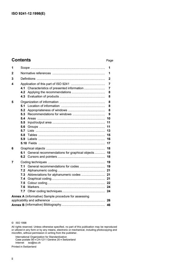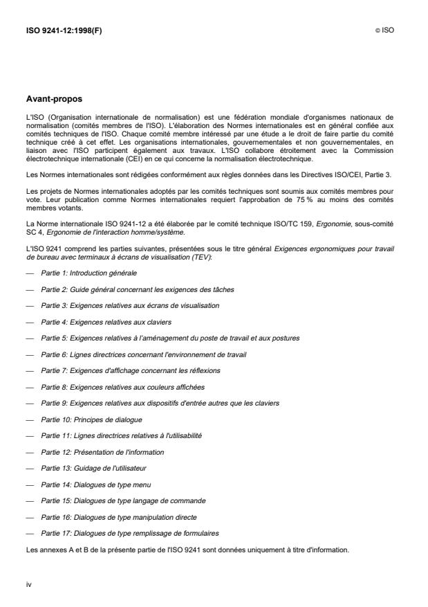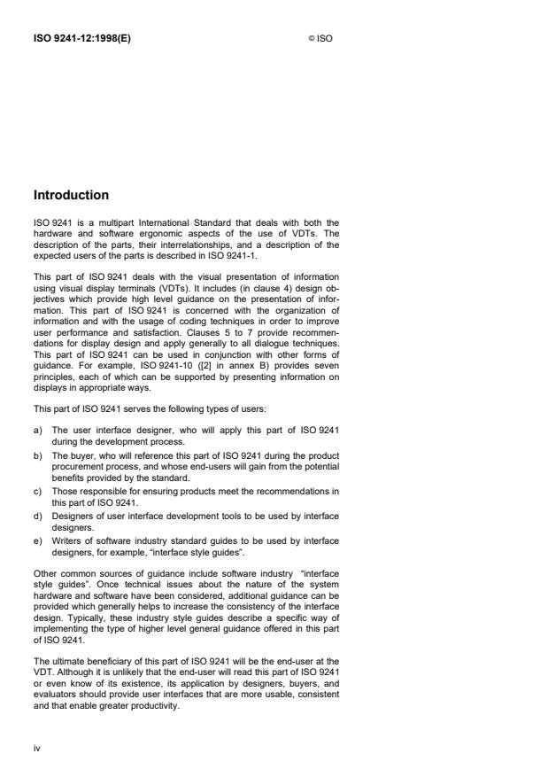 ISO 9241-12:1998 is a standard published by the International Organization for Standardization (ISO). Its full title is "Ergonomic requirements for office work with visual display terminals (VDTs) — Part 12: Presentation of information". This standard covers: Ergonomic requirements for office work with visual display terminals (VDTs) — Part 12: Presentation of information
