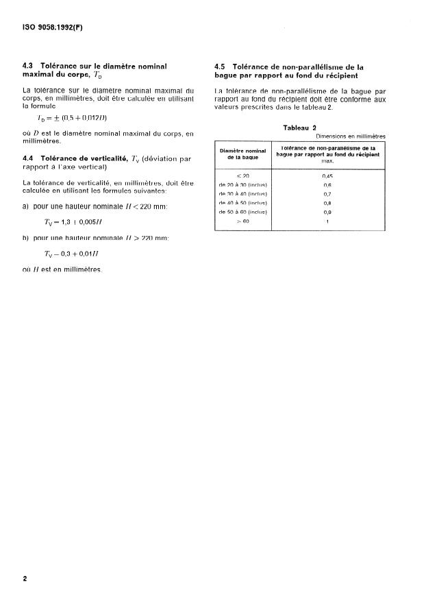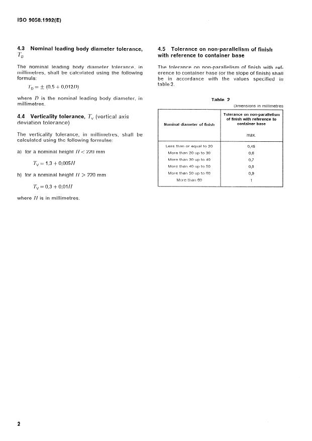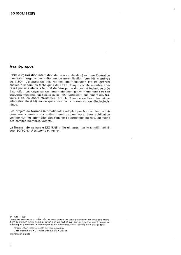 ISO 9058:1992 is a standard published by the International Organization for Standardization (ISO). Its full title is "Glass containers — Tolerances". This standard covers: Specifies tolerances for glass containers of circular cross-section and nominal capacity from 50 ml to 5 000 ml.