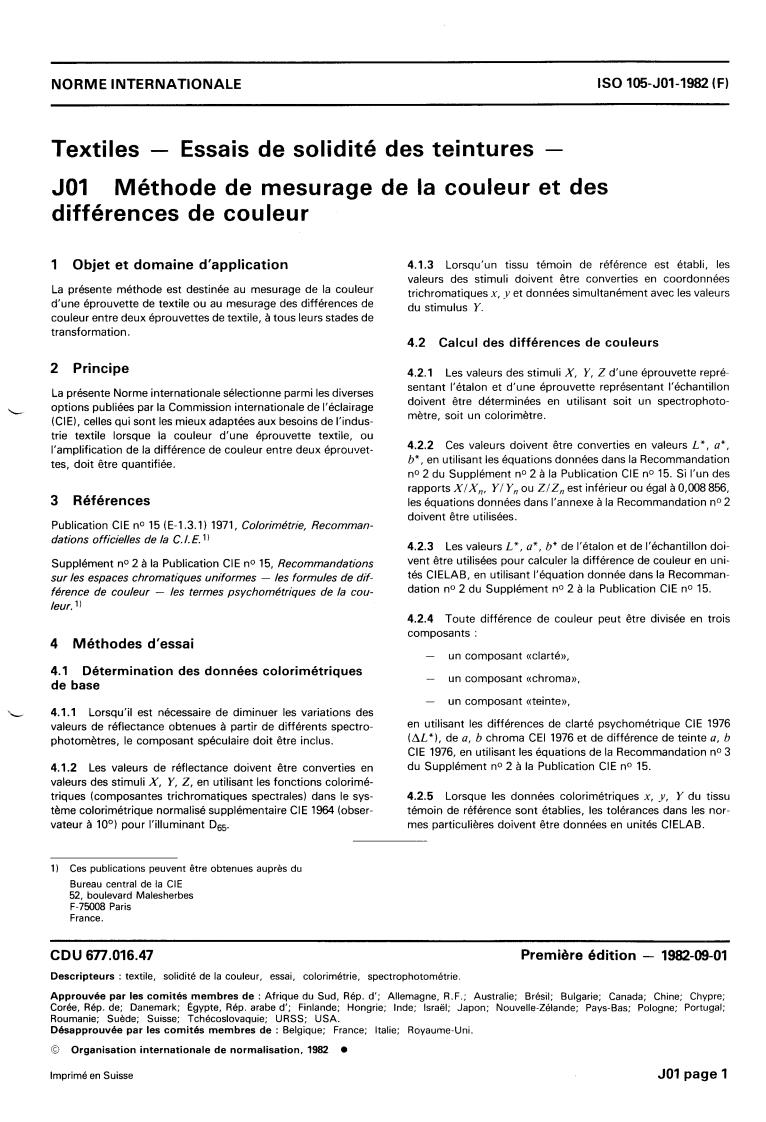 ISO 105-J:1982 - Textiles — Tests for colour fastness — Part J: Measurement of colour and colour differences Released:9/1/1982