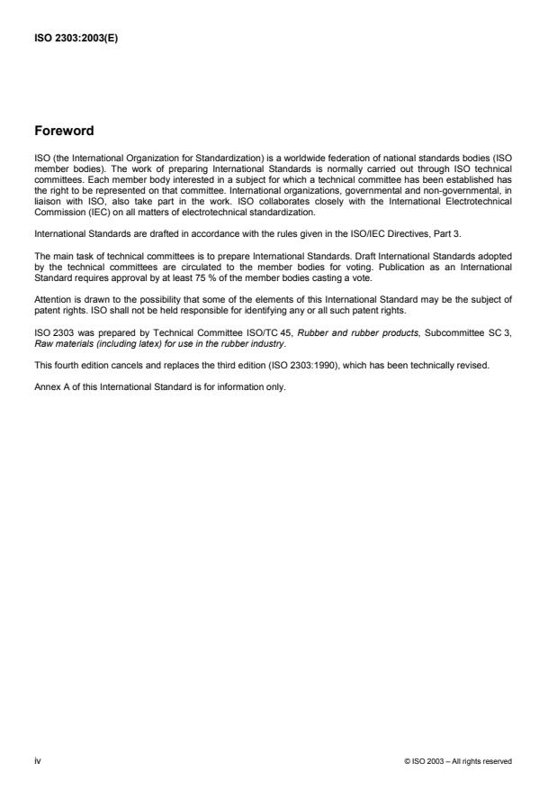 ISO 2303:2003 is a standard published by the International Organization for Standardization (ISO). Its full title is "Isoprene rubber (IR) — Non-oil-extended, solution-polymerized types — Evaluation procedure". This standard covers: ISO 2303 specifies, for general purpose non-oil-extended, solution-polymerized rubbers (IR): physical and chemical tests on raw rubbers; standard materials, standard test formulation, equipment and processing methods for evaluating the vulcanization characteristics. Two mill-mixing procedures are described in this Internatioanl Standard and an internal mixer-mill mixing procedure is described in an informative annex.