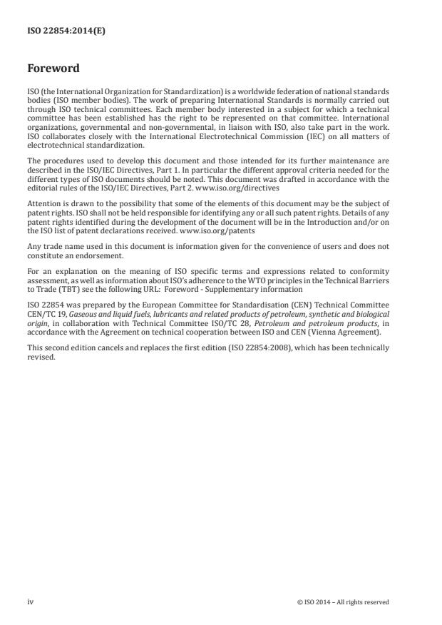 ISO 22854:2014 is a standard published by the International Organization for Standardization (ISO). Its full title is "Liquid petroleum products — Determination of hydrocarbon types and oxygenates in automotive-motor gasoline and in ethanol (E85) automotive fuel — Multidimensional gas chromatography method". This standard covers: ISO 22854:2014 specifies the gas chromatographic (GC) method for the determination of saturated, olefinic and aromatic hydrocarbons in automotive motor gasoline and automotive ethanol fuel (E85). Additionally, the benzene content, oxygenate compounds and the total oxygen content can be determined. This International Standard defines two procedures, A and B. Procedure A is applicable to automotive motor gasoline with a total volume fraction of aromatics of up to 50 %; a total volume fraction of olefins from about 1,5 % up to 30 %; a volume fraction of oxygenates, from 0,8 % up to 15 %; a total mass fraction of oxygen from about 1,5 % to about 3,7 %; and a volume fraction of benzene of up to 2 %. The system may be used for a volume fraction of ethers with 5 or more C atoms up to 22 % but the precision has not been established up to this level Although this test method may be used to determine higher-olefin contents of up to 50 % (V/V), the precision for olefins was tested only in the range from about 1,5 % (V/V) to about 30 % (V/V). Although specifically developed for the analysis of automotive motor gasoline that contains oxygenates, this test method may also be applied to other hydrocarbon streams having similar boiling ranges, such as naphthas and reformates. Procedure B describes the procedure for the analysis of oxygenated groups (ethanol, methanol, ethers, C3 ? C5 alcohols) in (automotive) ethanol fuels containing an ethanol volume fraction between 50 % and 85 %. The gasoline is diluted with an oxygenate-free component to lower the ethanol content to a value below 20 % (V/V) before the analysis by GC. If the ethanol content is known, the dilution factor can be established accordingly. If it is unknown, it is advised to use a dilution of 4:1 when analysing the sample. The sample may be fully analysed including hydrocarbons. Precision data for the diluted sample is only available for the oxygenated groups.