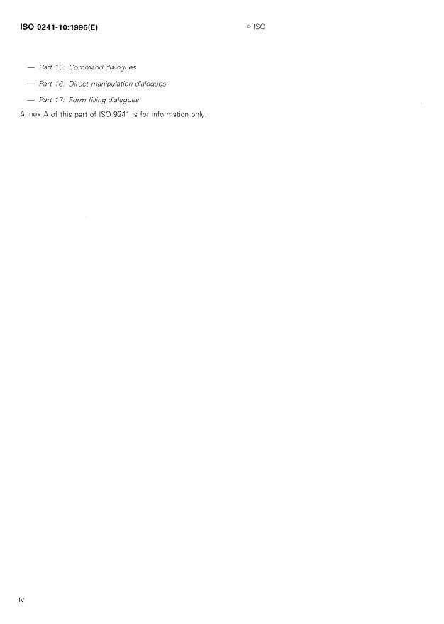 ISO 9241-10:1996 is a standard published by the International Organization for Standardization (ISO). Its full title is "Ergonomic requirements for office work with visual display terminals (VDTs) — Part 10: Dialogue principles". This standard covers: Gives ergonomic principles formulated in general terms; they are presented without reference to situations of use, application, environment or technology. These principles are intended to be used in specifications, design and evaluation of dialogues for office work with visual display terminals (VDTs).