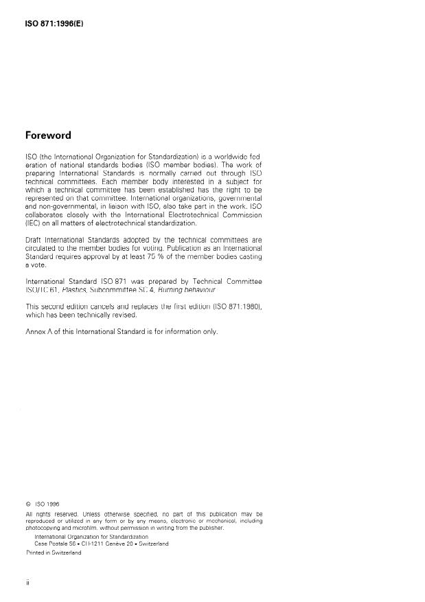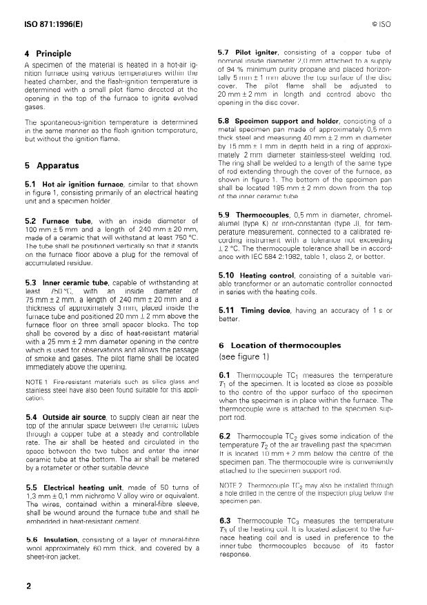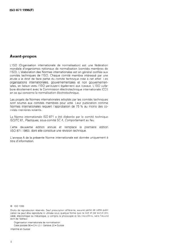 ISO 871:1996 is a standard published by the International Organization for Standardization (ISO). Its full title is "Plastics — Determination of ignition temperature using a hot-air furnace". This standard covers: Gives a laboratory method for determining the flash-ignition temperature and spontaneous-ignition temperature of plastics using a hot-air furnace. Does not give a direct measure of the combustability or rate of burning of plastics. Replaces the first edition.