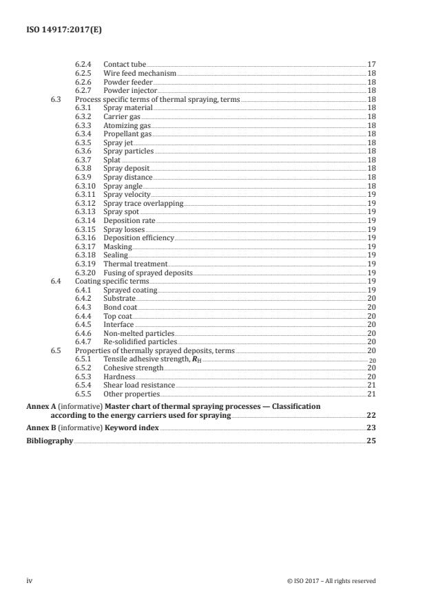 ISO 14917:2017 defines processes and general terms for thermal spraying. It classifies thermal spraying processes according to type of spray material, to type of operation and to type of energy carrier. It specifies abbreviations for spray processes, sprayed coatings, and manufacturing steps.