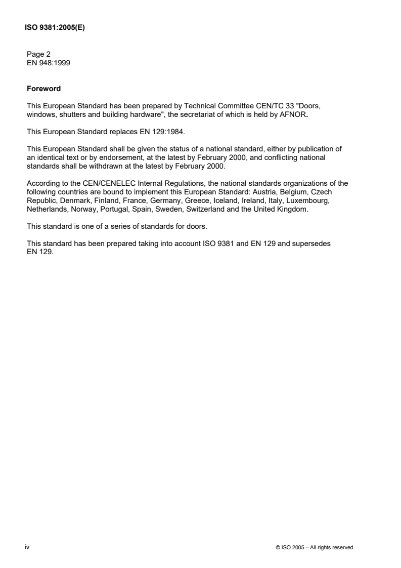 Replaced by EN 948:1999 and closely aligned with ISO 9381, it addressed door leaf testing methods in Europe.EN 948:1999