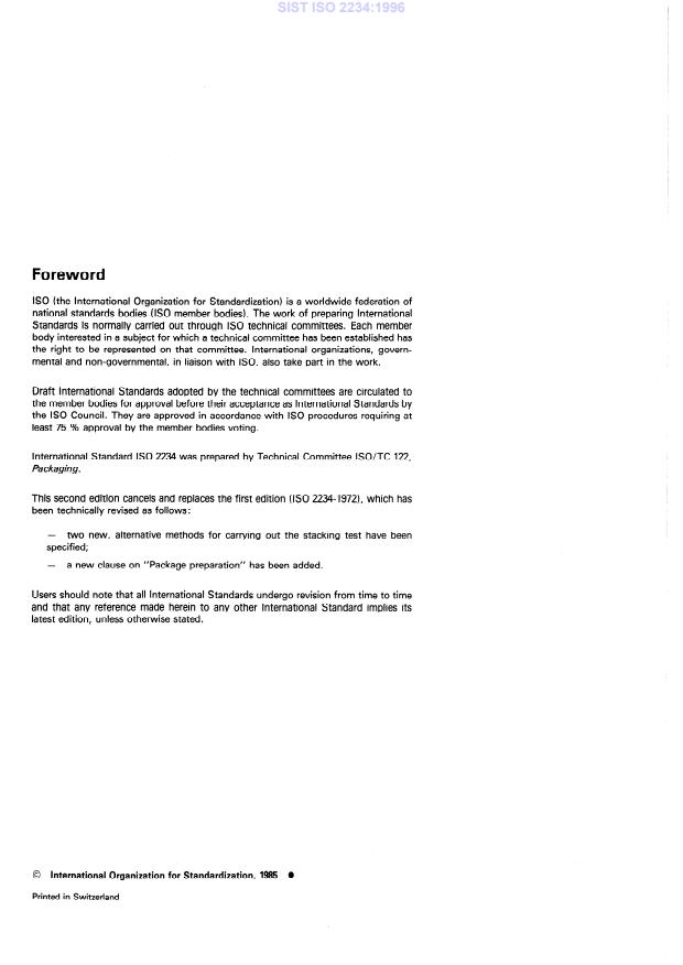 ISO 2234:1985 is a standard published by the International Organization for Standardization (ISO). Its full title is "Packaging — Complete, filled transport packages — Stacking tests using static load". This standard covers: Packaging — Complete, filled transport packages — Stacking tests using static load