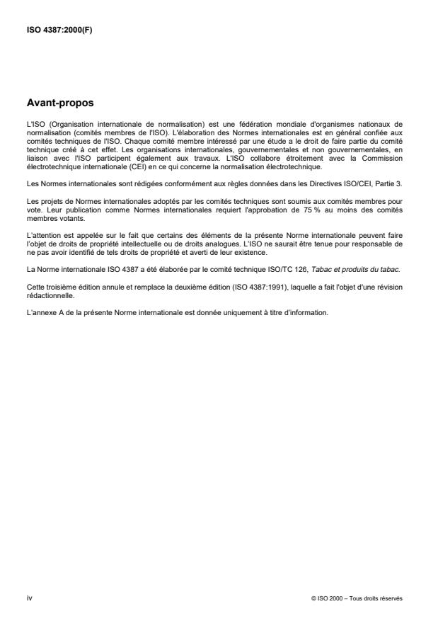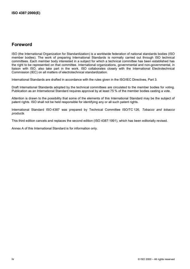 ISO 4387:2000 is a standard published by the International Organization for Standardization (ISO). Its full title is "Cigarettes — Determination of total and nicotine-free dry particulate matter using a routine analytical smoking machine". This standard covers: La présente Norme internationale spécifie des méthodes de détermination de la matière particulaire totale et de détermination ultérieure de la matière particulaire anhydre et exempte de nicotine, présente dans la fumée de cigarette, produite et recueillie au moyen d'une machine à fumer analytique de routine.