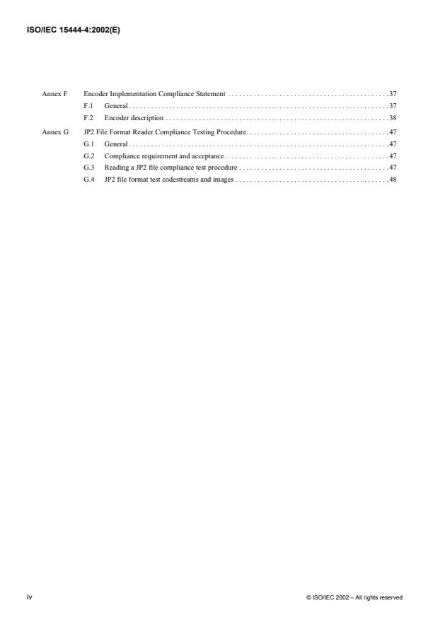 ISO/IEC 15444-4:2002 specifies the framework, concepts, methodology for testing, and criteria to be achieved to claim compliance to ITU-T Recommendation T.800 | ISO/IEC 15444-1. It provides a framework for specifying abstract test suites and for defining the procedures to be followed during compliance testing. ISO/IEC 15444-4:2002 specifies compliance testing procedures for encoding and decoding using JPE 2000 Part 1 (ITU-T Recommendation T.800 | ISO/IEC 15444-1); specifies codestreams, decoded images, and error metrics to be used with the testing procedures; specifies abstract test suites; provides guidance for creating an encoder compliance test. ISO/IEC 15444-4:2002 does not include the following tests: Acceptance testing: the process of determining whether an implementation satisfies acceptance criteria and enables the user to determine whether or not to accept the implementation. This includes the planning and execution of several kinds of tests (e.g. functionality, quality, and speed performance testing) that demonstrate that the implementation satisfies the user requirements. Performance testing: measures the performance characteristics of an Implementation Under Test (IUT) such as its throughput, responsiveness, etc., under various conditions. Robustness testing: the process of determining how well an implementation processes data which contains errors.