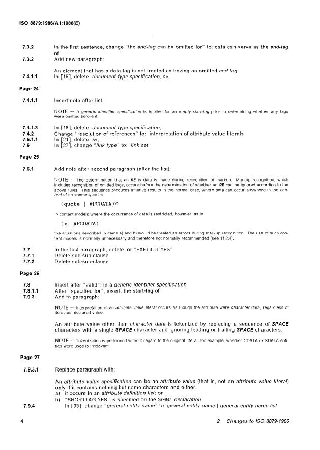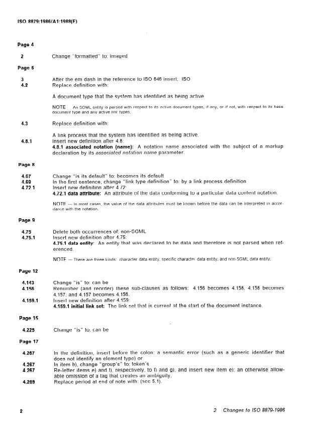 Enhances the technical content of ISO 8879. Changes are listed in order by page number and clause or sub-clause number. Clauses of concern are: 4, 7, 9, 10, 11, 12, and 15.