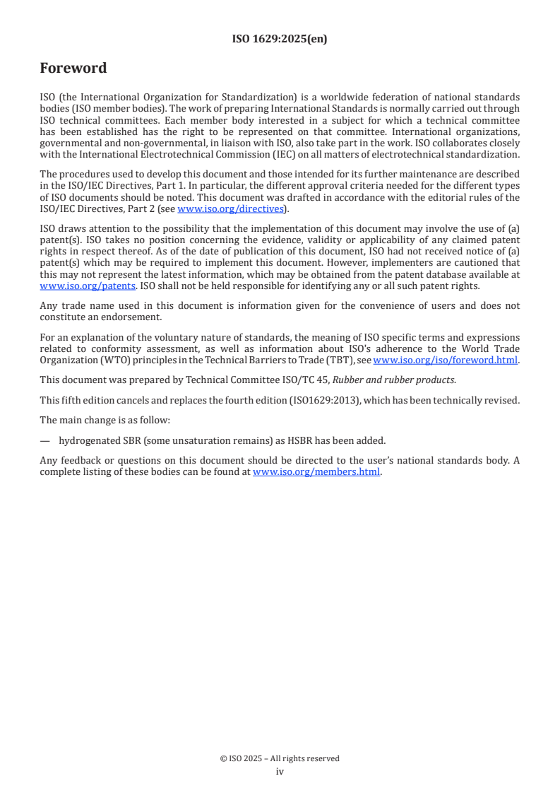 ISO 1629:2025 is a standard published by the International Organization for Standardization (ISO). Its full title is "Rubber and latices - Nomenclature". This standard covers: This document establishes a system of symbols for the basic rubbers in both dry and latex forms, based on the chemical composition of the polymer chain. The purpose of this document is to standardize the abbreviated terms used in industry, commerce and government.