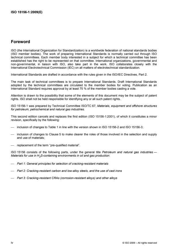 ISO 15156-1:2009 is a standard published by the International Organization for Standardization (ISO). Its full title is "Petroleum and natural gas industries — Materials for use in H2S-containing environments in oil and gas production — Part 1: General principles for selection of cracking-resistant materials". This standard covers: ISO 15156-1:2009 describes general principles and gives requirements and recommendations for the selection and qualification of metallic materials for service in equipment used in oil and gas production and in natural-gas sweetening plants in H2S-containing environments, where the failure of such equipment can pose a risk to the health and safety of the public and personnel or to the environment. ISO 15156-1:2009 can be applied to help to avoid costly corrosion damage to the equipment itself. It supplements, but does not replace, the materials requirements given in the appropriate design codes, standards or regulations. ISO 15156-1:2009 addresses all mechanisms of cracking that can be caused by H2S, including sulfide stress cracking, stress corrosion cracking, hydrogen-induced cracking and stepwise cracking, stress-oriented hydrogen-induced cracking, soft zone cracking and galvanically induced hydrogen stress cracking. A non-exhaustive list is provided of equipment to which ISO 15156-1:2009 is applicable, together with permitted exclusions. ISO 15156-1:2009 applies to the qualification and selection of materials for equipment designed and constructed using conventional elastic design criteria. ISO 15156-1:2009 is not necessarily applicable to equipment used in refining or downstream processes and equipment.