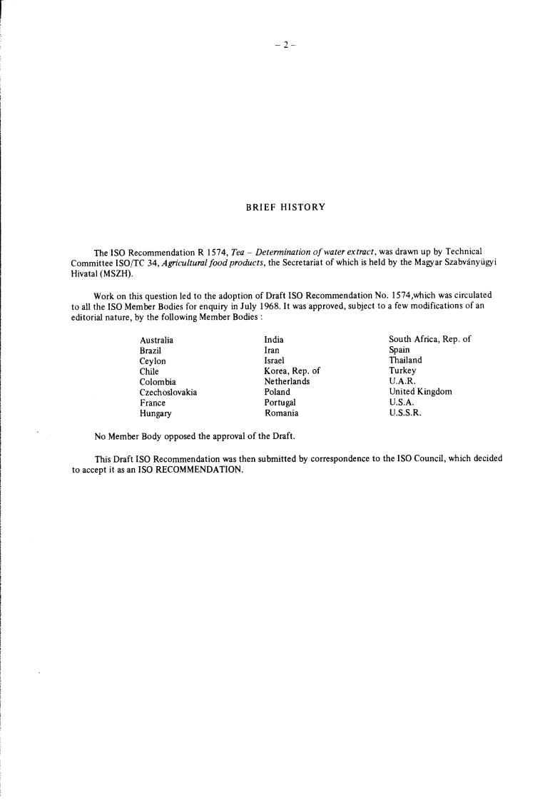 The IS0 Recommendation R 1574, Tea - Determination of water extract, was drawn up by Technical