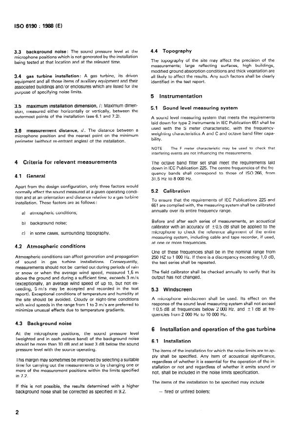 ISO 6190:1988 is a standard published by the International Organization for Standardization (ISO). Its full title is "Acoustics — Measurement of sound pressure levels of gas turbine installations for evaluating environmental noise — Survey method". This standard covers: Acoustics — Measurement of sound pressure levels of gas turbine installations for evaluating environmental noise — Survey method