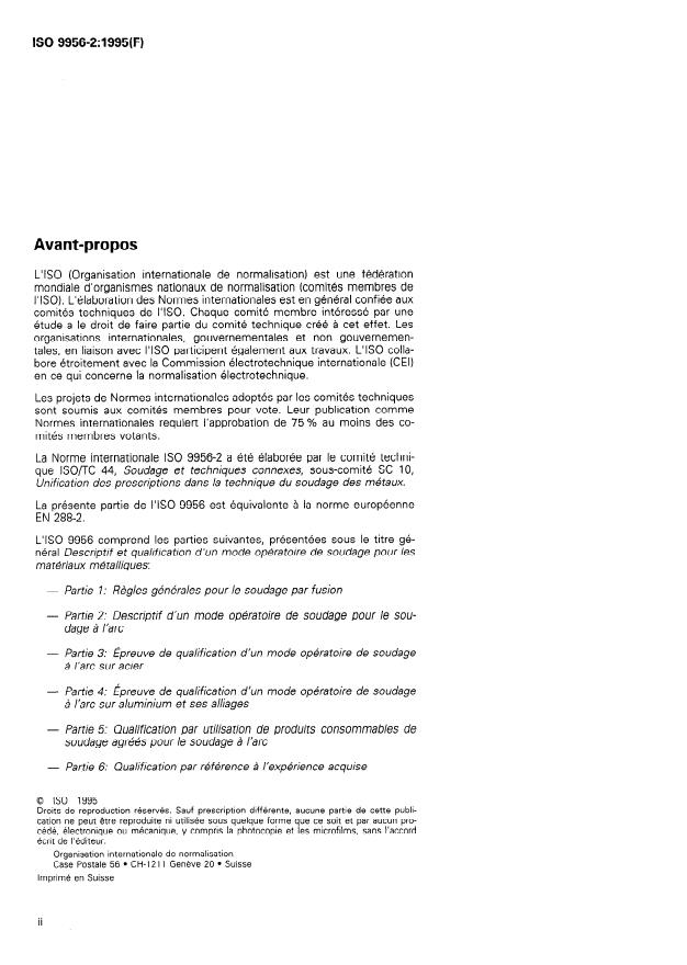 ISO 9956-2:1995 is a standard published by the International Organization for Standardization (ISO). Its full title is "Specification and approval of welding procedures for metallic materials — Part 2: Welding procedure specification for arc welding". This standard covers: Requirements for the content of welding procedure specifications for arc welding processes. The principles may be also applied to other fusion welding processes subject to agreement.