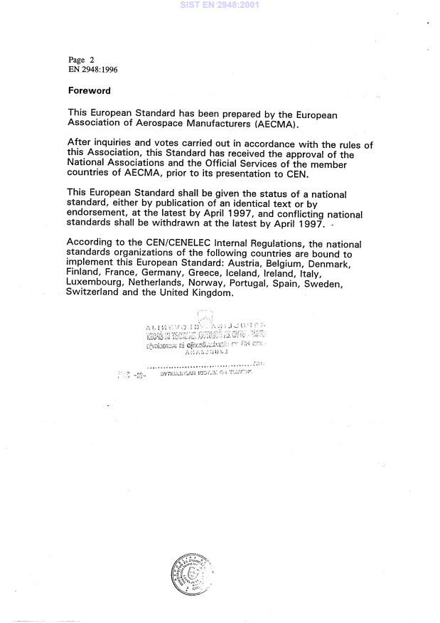 Keywords: SIST EN 2948:2001, aerospace washers, tab washers, heat resisting steel washers, passivated washers, high-temperature washers, aerospace fasteners, anti-loosening washers, corrosion resistant aerospace components, thermal stability washers, aerospace locking washers, CEN standards, aerospace engineering standards
