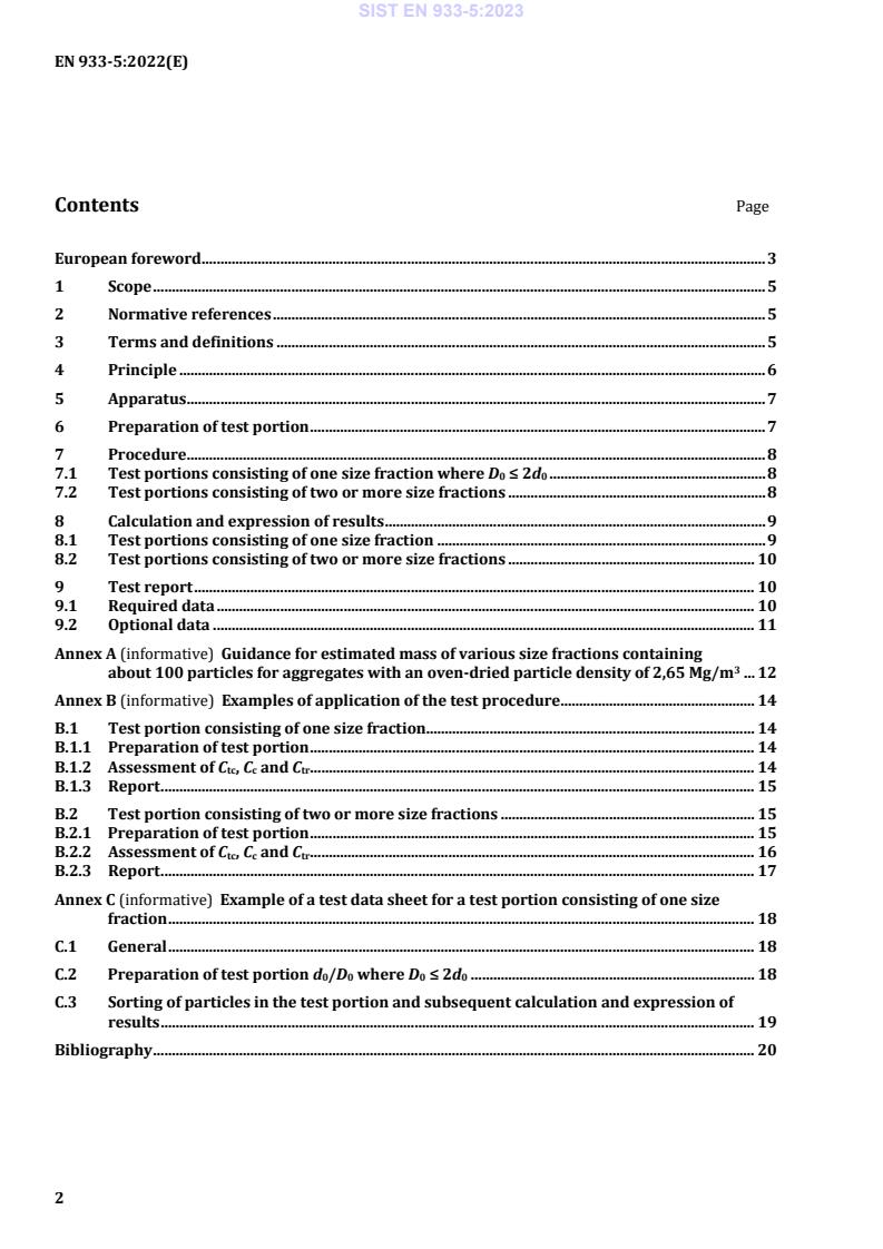 SIST EN 933-5:2023 is a standard published by the Slovenian Institute for Standardization (SIST). Its full title is "Tests for geometrical properties of aggregates - Part 5: Determination of percentage of crushed particles in coarse and all-in natural aggregates". This standard covers: This document specifies the reference method, used for type testing and in case of dispute, for the determination of the percentages of crushed particles, totally crushed particles and totally rounded particles in coarse and all-in natural aggregates. Other methods can be used for other purposes, such as factory production control, provided that an appropriate working relationship with the reference method has been established. NOTE 1 Examples of advanced test methods can be found in the Bibliography. This document applies to coarse aggregates comprising particles within size fraction 4/63 mm. It does not apply to lightweight aggregates. NOTE 2 For coarse aggregate between 4 mm and 20 mm the percentages of crushed surfaces are linked to the flow coefficient and can therefore be used in association with the test method specified in EN 933 6. Clause 7.1 specifies the procedure for test portions consisting of one size fraction and Clause 7.2 specifies the procedure for test portions consisting of two or more size fractions. Guidance for the estimated mass of various size fractions with about 100 particles is given in informative Annex A. Examples of application of the test procedure and an example of a test data sheet are given in informative Annexes B and C.
