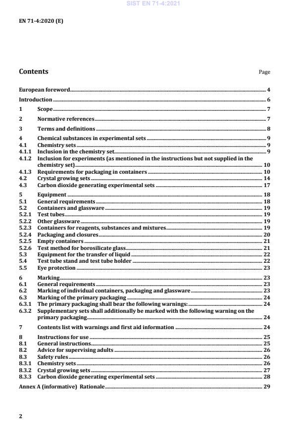 SIST EN 71-4:2021 is a standard published by the Slovenian Institute for Standardization (SIST). Its full title is "Safety of toys - Part 4: Experimental sets for chemistry and related activities". This standard covers: This document specifies requirements for the maximum amount, and in some cases, the maximum concentration of certain substances and mixtures used in experimental sets for chemistry and related activities. These substances and mixtures are: - those classified as hazardous by the EC-legislation applying to hazardous substances and hazardous mixtures [1]; - substances and mixtures which in excessive amounts could harm the health of the children using them and which are not classified as hazardous by the above-mentioned legislation; and - any other chemical substance(s) and mixture(s) delivered with the experimental set. This document applies to experimental sets for chemistry and related activities including crystal growing sets, carbon dioxide generating experimental sets and supplementary sets. It also covers sets for chemical experiments within the fields of mineralogy, biology, physics, microscopy and environmental science whenever they contain one or more chemical substances and/or mixtures which are classified as hazardous according to Regulation (EC) No. 1272/2008 [1]. This document also specifies requirements for marking, a contents list, instructions for use, eye protection and for the equipment intended for carrying out the experiments. This document does not apply to combined sets, e.g. a combination of a chemistry set and a crystal growing set. It also does not apply to toys that are covered by EN 71-13 (e.g. cosmetic kits). Requirements for certain other chemical toys are given in EN 71-5. NOTE The terms "substance" and "preparation", are used in the "REACH Regulation", Regulation (EC) No. 1907/2006 [2]. According to the Globally Harmonized System (GHS) of classification and labelling of chemicals, which in the European Union has been enacted by Regulation (EC) No. 1272/2008 (classification, labelling and packaging of substances and mixtures) [1], the timetable for the introduction of GHS is followed. The words "preparation" and "mixture" are considered synonymous; both are a mixture or solution of substances that do not react with each other. The old term "preparation" will be replaced by the new term "mixture" in due course. In this document, only the term "mixture" is used.