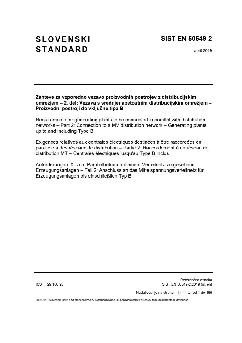 SIST EN 50549-2:2019 is a standard published by the Slovenian Institute for Standardization (SIST). Its full title is "Requirements for generating plants to be connected in parallel with distribution networks - Part 2: Connection to a MV distribution network - Generating plants up to and including Type B". This standard covers: This standard provides technical requirements for the connection of generating plants up to and including Type B which can be operated in parallel with a public MV distribution network. They are intended to be used as a technical reference for connection agreements between DSOs and electricity producers and to demonstrate compliance with COMMISSION REGULATION (EU) 2016/631 (Requirements for Generators).