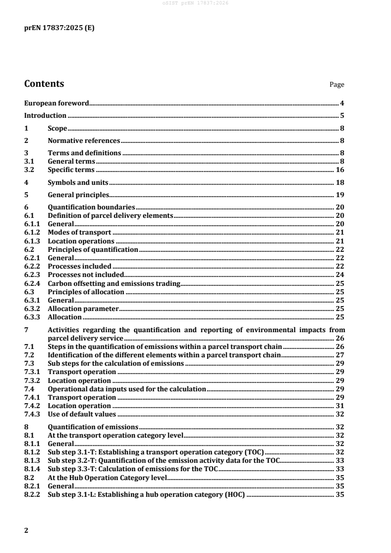 oSIST prEN 17837:2026 is a draft published by the Slovenian Institute for Standardization (SIST). Its full title is "Postal services - Parcel delivery environmental footprint - Methodology for calculation and declaration of GHG emissions and air pollutants of parcel logistics delivery services". This standard covers: This document establishes a common methodology for the calculation, allocation and declaration of greenhouse gases (GHGs) as well as air pollutant emissions related to any parcel delivery service. It only covers a part of the entire retail value chain. The retail value chain usually consists of creating the product, storing the inventory, distributing the goods and making the product available for consumers. This document includes only the distribution of goods but considers the entire value chain of the parcel transportation process flow, namely the collection and delivery rounds, the trunking and the operations due to processing and the physical handling of parcels. See Figure 1 below for a graphical illustration. Figure 1 - Overview of parcel delivery operations