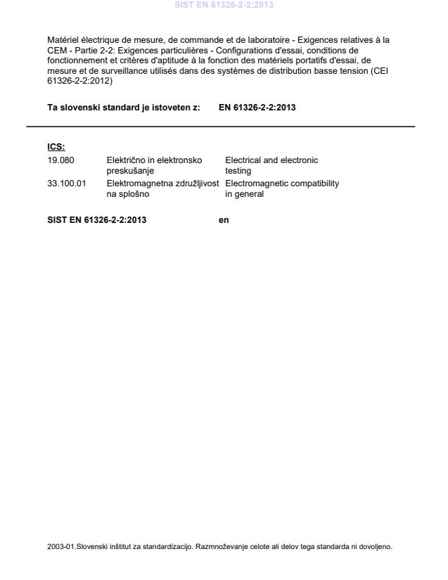 SIST EN 61326-2-2:2013 is a standard published by the Slovenian Institute for Standardization (SIST). Its full title is "Electrical equipment for measurement, control and laboratory use - EMC requirements - Part 2-2: Particular requirements - Test configurations, operational conditions and performance criteria for portable test, measuring and monitoring equipment used in low-voltage distribution systems (IEC 61326-2-2:2012)". This standard covers: IEC 61326-2-2:2012 specifies more detailed test configurations, operational conditions and performance criteria for equipment covered by Annex A of IEC 61326-1 which is used for testing, measuring or monitoring of protective measures in low-voltage distribution systems, and; powered by battery and/or from the circuit measured, and portable. This second edition cancels and replaces the first edition published in 2005. This edition constitutes a technical revision. The main technical changes are: Update with respect to IEC 61326-1:2012.