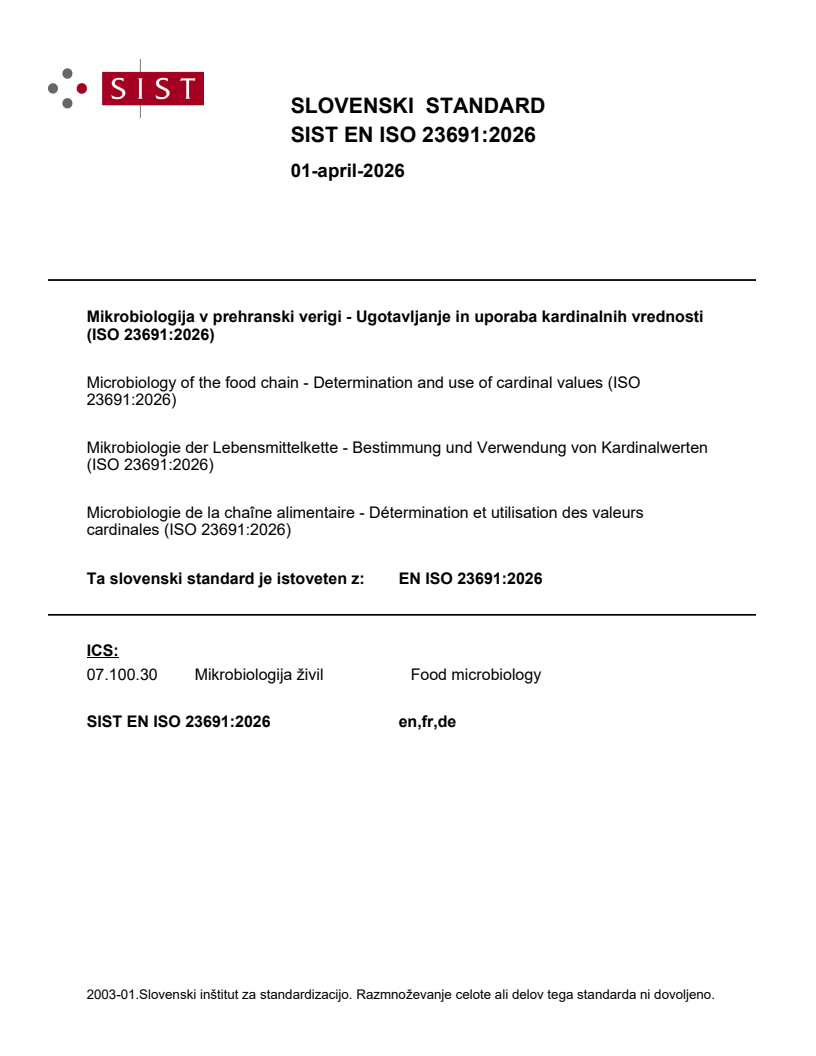 Mikrobiologija v prehranski verigi - Ugotavljanje in uporaba kardinalnih vrednosti (ISO 23691:2026)