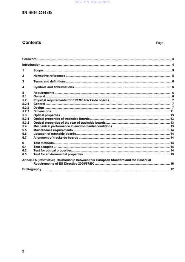 Foreword . 3 Introduction . 4 1 Scope. 5 2 Normative references . 5 3 Terms and definitions . 6 4 Symbols and abbreviations . 6 5 Requirements . 6 5.1 General . 6 5.2 Physical requirements for ERTMS trackside boards . 7 5.2.1 General . 7 5.2.2 Design . 7 5.2.3 Dimensions . 11 5.3 Optical properties . 13 5.3.1 Optical properties of trackside boards . 13 5.3.2 Optical properties of the rear of trackside boards . 13 5.4 Mechanical performance in environmental conditions . 13 5.5 Maintenance requirements . 14 5.6 Location of trackside boards . 14 5.7 Alignment of trackside boards . 14 6 Test methods . 14 6.1 Test samples . 14 6.2 Test for optical properties . 14 6.3 Test for environmental properties . 15 Annex ZA (informative)