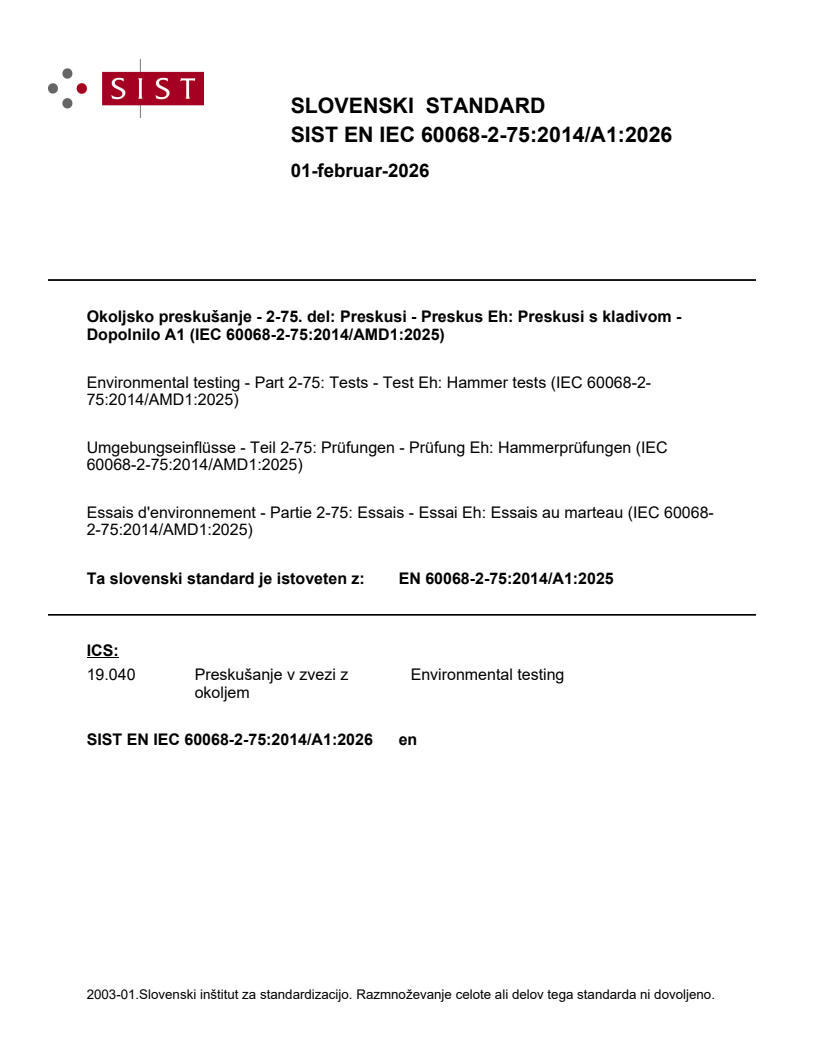 SIST EN IEC 60068-2-75:2014/A1:2026 is a amendment published by the Slovenian Institute for Standardization (SIST). Its full title is "Environmental testing - Part 2-75: Tests - Test Eh: Hammer tests (IEC 60068-2-75:2014/AMD1:2025)". This standard covers: The content of the corrigendum 1 of amendment 1 (2025-12) applies only to the French version.
