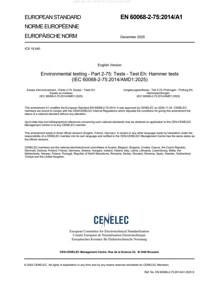 This amendment A1 modifies the European Standard EN 60068-2-75:2014; it was approved by CENELEC on 2025-11-25. CENELEC
