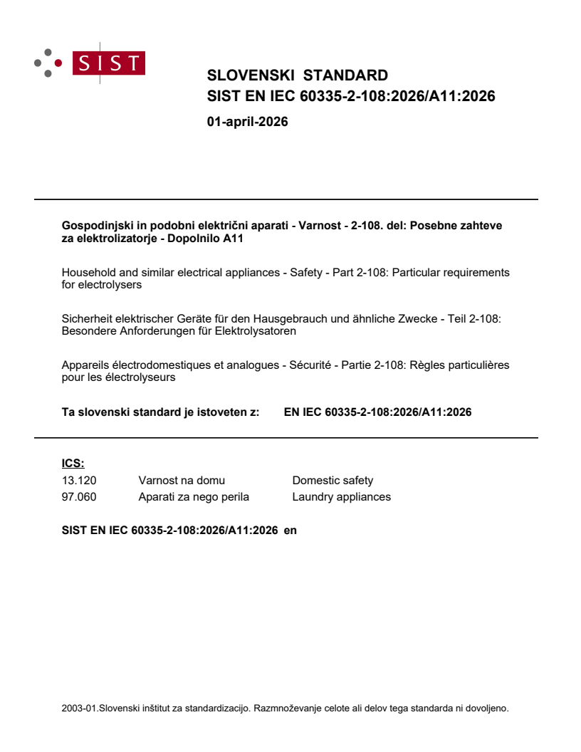 SIST EN IEC 60335-2-108:2026/A11:2026 is a amendment published by the Slovenian Institute for Standardization (SIST). Its full title is "Household and similar electrical appliances - Safety - Part 2-108: Particular requirements for electrolysers". This standard covers: This part of IEC 60335 deals with the safety of electrolysers that produce low viscosity, ionized liquids intended for use as detergent free wash water in appliances for household and similar purposes and which conform with the standards applicable to such appliances. It applies to electrolysers tested separately, under the most severe conditions that can be expected to occur in normal use, their rated voltage being not more than 250 V including direct current (DC) supplied appliances and battery-operated appliances.