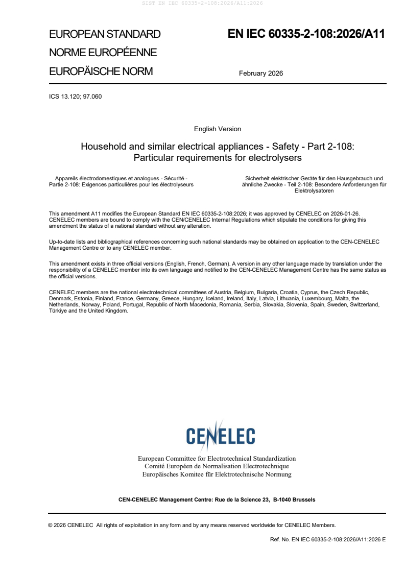 This standard applies to electrolysers tested independently under the most severe conditions expected in normal usage. It covers appliances with rated voltages up to 250 V, including direct current (DC) and battery-operated devices. The document amends the existing EN IEC 60335-2-108:2025 standard and is intended for adoption by all CENELEC members to ensure uniform safety practices across Europe.