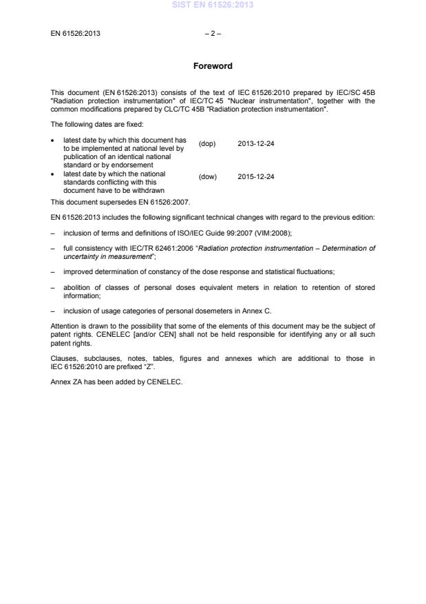 – 3 – EN 61526:2013 Endorsement notice The text of the International Standard IEC 61526:2010 was approved by CENELEC as a European Standard with agreed common modifications. COMMON MODIFICATIONS Introduction In the third paragraph, add “mean beta particle energy” after “0,8 MeV”. 1 Scope and object Add “for the same radiations (for alarming purposes)” at the end of list item b). 3 Terms and definitions In the term and in the definition of 3.31, replace 'assembly' by 'detector assembly'. 6 General characteristics 6.6 Effective range of measurement In the first paragraph, add “at least” between “Hp(10) and” and “from 1 mSv”. 6.9 Indication due to instrument artefacts Replace the title by “Indication due to the intrinsic background of the instrument”. In the first paragraph, replace “Hp(10)” by “Hp(10) and Hp(0,07)”. 9 Radiation performance requirements and tests 9.3.5 Method of test for photon dosemeters using natural radiation In list item b), second sentence, add “mean” in front of “background dose rate” and delete “and "constant"”. 9.3.6 Interpretation of the results of the test using natural radiation In the first paragraph and in the note, replace “inequation” by “inequality” (this modification refers to the English version only). 9.5.1.2 Method of test In the third paragraph, first line, delete “above” in front of “requirements” and add “with the above mentioned reference radiations” after “cannot be met”. In the beginning of the list items a), b) and c), add “relative” between “If the” and “response for”. 9.9.1 General In the first sentence, replace “performed separately for Hp(10) or Hp(10) and for Hp(0,07) or Hp(0,07)” by “performed for Hp(10), Hp(10), Hp(0,07) and Hp(0,07)”. At the end of the first sentence, delete “category, see Annex C”. Annexes Add the following new annex. SIST EN 61526:2013