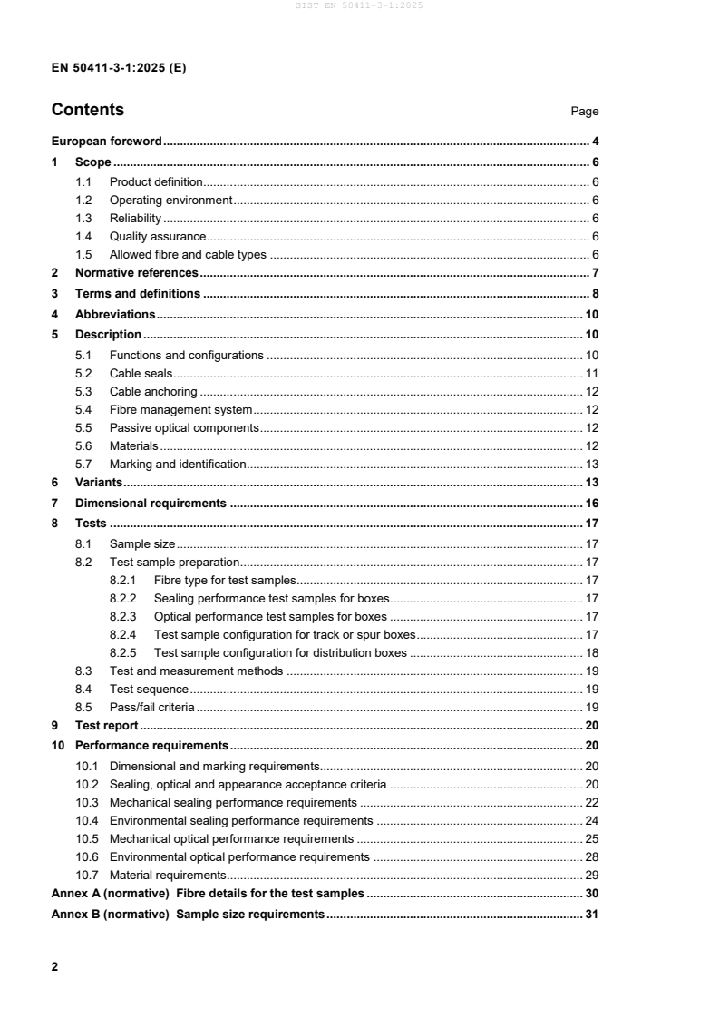 EN 50411-3-1:2025 specifies product requirements for wall or pole mounted fibre splice boxes used in optical‑fibre communication systems. It defines dimensional, optical, mechanical and environmental performance criteria for fully installed boxes of up to 288 fibre splices, intended for above‑ground indoor (Category C) and aerial/outdoor (Category A) environments. The standard covers protective housings that contain a fibre management system (FMS) with splice trays, storage and routing, uncut cable storage and passive optical devices (splitters/WDM).