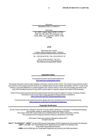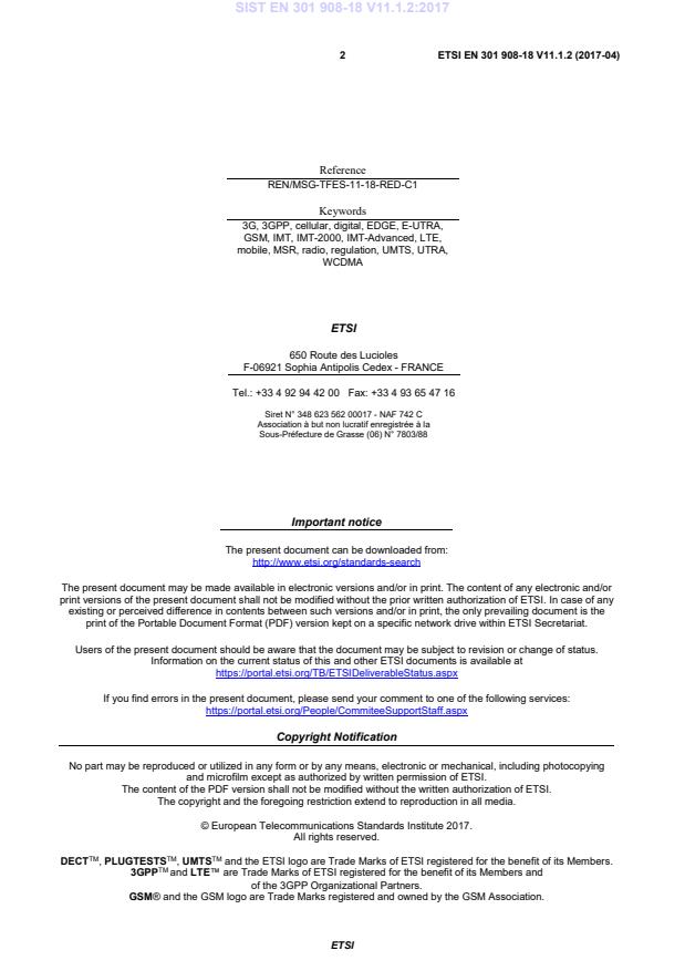 DECTTM, PLUGTESTSTM, UMTSTM and the ETSI logo are Trade Marks of ETSI registered for the benefit of its Members. 3GPPTM and LTE™ are Trade Marks of ETSI registered for the benefit of its Members and of the 3GPP Organizational Partners. GSM® and the GSM logo are Trade Marks registered and owned by the GSM Association. SIST EN 301 908-18 V11.1.2:2017