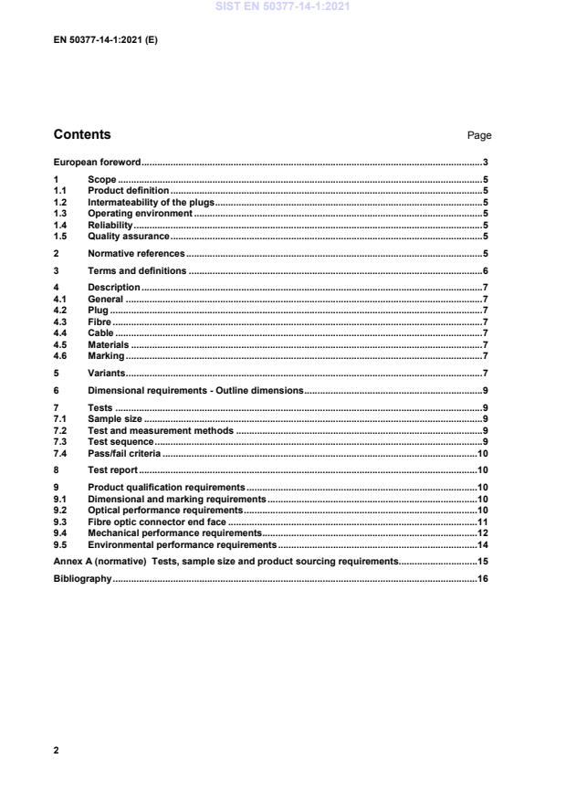 SIST EN 50377-14-1:2021 is a standard published by the Slovenian Institute for Standardization (SIST). Its full title is "Connector sets and interconnect components to be used in optical fibre communication systems - Product specifications Part 14-1: Simplex and duplex cords made from simplex plugs with cylindrical ferrules, using EN 60793-2-50 single-mode B-652 ou B-657 fibre for Category C according to EN 61753-1". This standard covers: 1.1 Product definition This document contains the initial, start of life, dimensional, optical, mechanical and environmental performance requirements that an assembled single mode cord with cylindrical ferruled connectors will meet in order for it to be categorized as an EN standard product. Since different variants and grades of performance are permitted, product marking details are given in 4.5 and Clause 5. 1.2 Intermateability of the plugs Where the products conforming to the requirements of this document are intermateable, the resulting level of random attenuation performance will be in accordance with Table 1. The intention is that this will be true irrespective of the manufacturing source(s) of the product. When intermating plug variants having different attenuation grades (as specified in EN 61755 1) the resulting level of attenuation cannot be any better than the worst attenuation grade of the individual plugs. Intermating a grade C plug with a grade B plug will result in a grade C level of random attenuation performance. Table 1 — Attenuation grade matrix Plug 1 grade Plug 2 grade Ensured attenuation grade B B B C C C B C C C B C 1.3 Operating environment The tests selected, combined with the severities and durations, are representative of an EN IEC 61753 1 Category C environment. 1.4 Reliability Whilst the anticipated service life expectancy of the product in this environment is 20 years, compliance with this standard does not guarantee the reliability of the product. This is predicted using a recognized reliability assessment program. 1.5 Quality assurance Compliance with this standard does not guarantee the manufacturing consistency of the product. This is expected to be maintained using a recognized quality assurance program.
