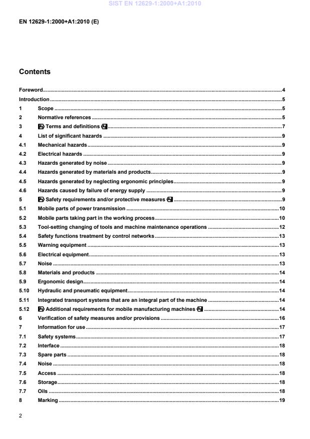 Contents Foreword . 4Introduction . 51Scope . 52Normative references . 53!!!!Terms and definitions"""" . 74List of significant hazards . 94.1Mechanical hazards . 94.2Electrical hazards . 94.3Hazards generated by noise . 94.4Hazards generated by materials and products . 94.5Hazards generated by neglecting ergonomic principles . 94.6Hazards caused by failure of energy supply . 95!!!!Safety requirements and/or protective measures"""" . 95.1Mobile parts of power transmission . 105.2Mobile parts taking part in the working process . 105.3Tool-setting changing of tools and machine maintenance operations . 125.4Safety functions treatment by control networks . 135.5Warning equipment . 135.6Electrical equipment . 135.7Noise . 135.8Materials and products . 145.9Ergonomic design. 145.10Hydraulic and pneumatic equipment . 145.11Integrated transport systems that are an integral part of the machine . 145.12!!!!Additional requirements for mobile manufacturing machines"""" . 146Verification of safety measures and/or provisions . 167Information for use . 177.1Safety systems . 177.2Interface . 187.3Spare parts . 187.4Noise . 187.5Access . 187.6Storage . 187.7Oils . 188Marking . 19SIST EN 12629-1:2000+A1:2010